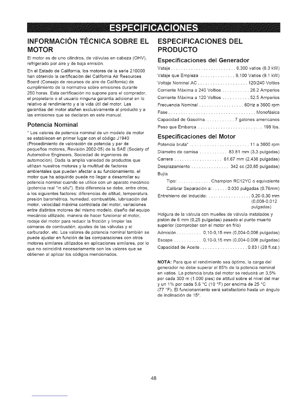 Frecuencia Nominal .................. 60Hz a 3600 rpm