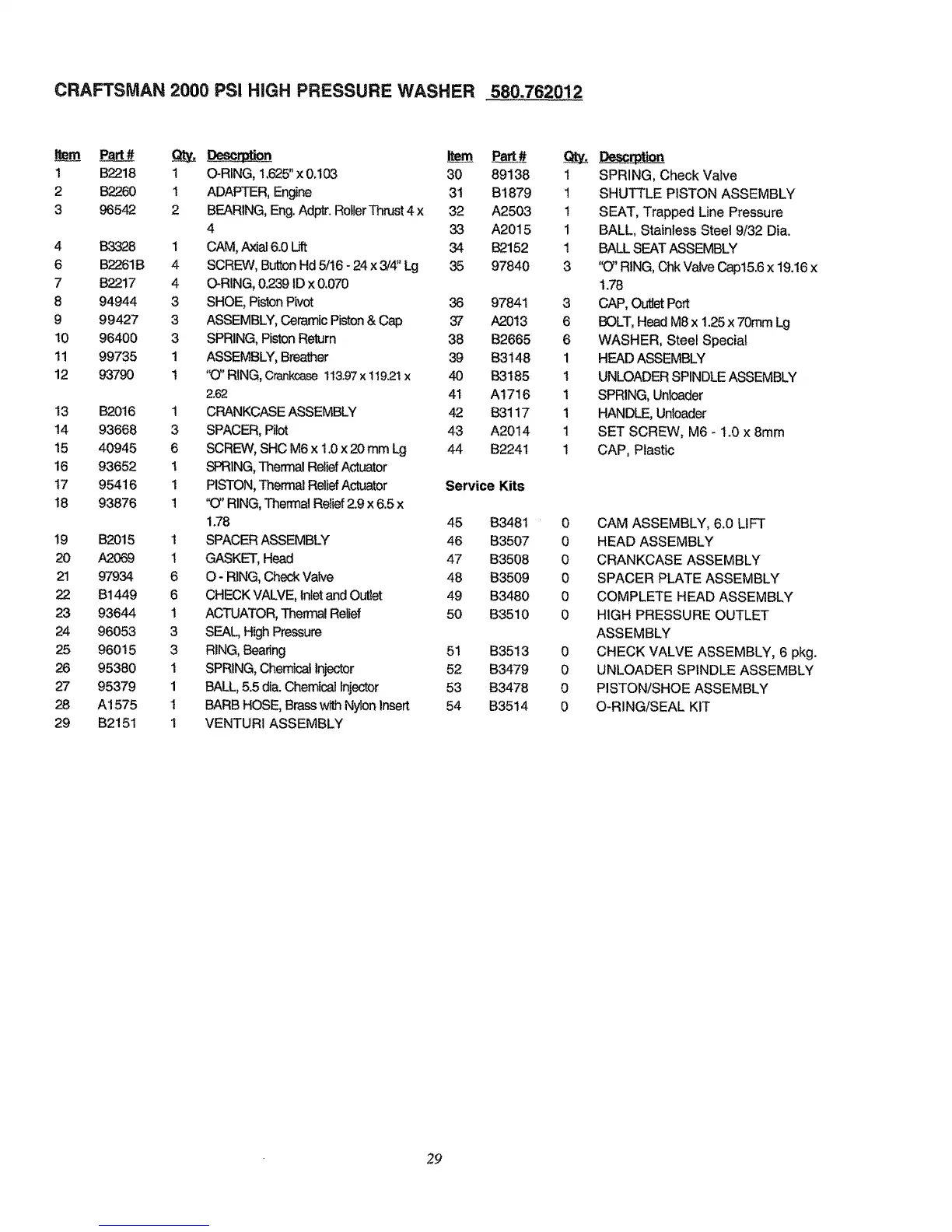 CRAFTSMAN 2000 PSI HiGH PRESSURE WASHER 580.762012