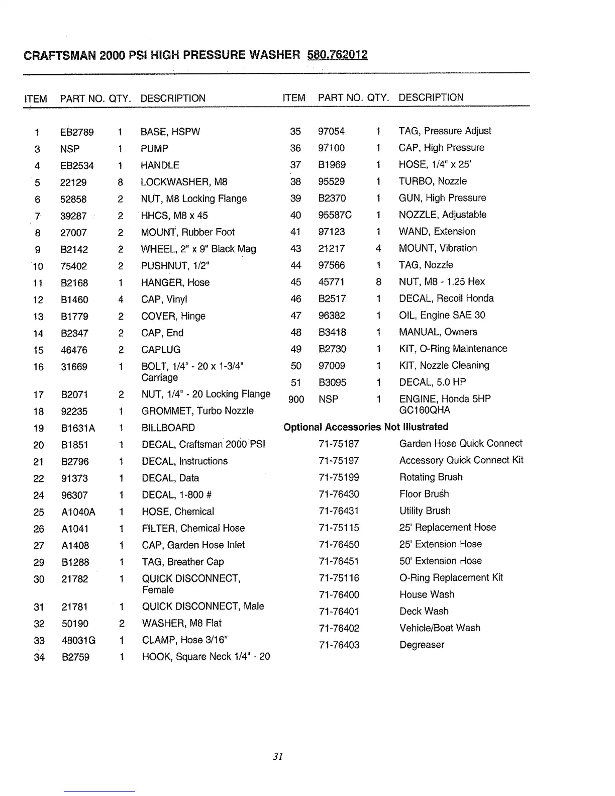 CRAFTSMAN 2000 PSI HiGH PRESSURE WASHER 580.762012