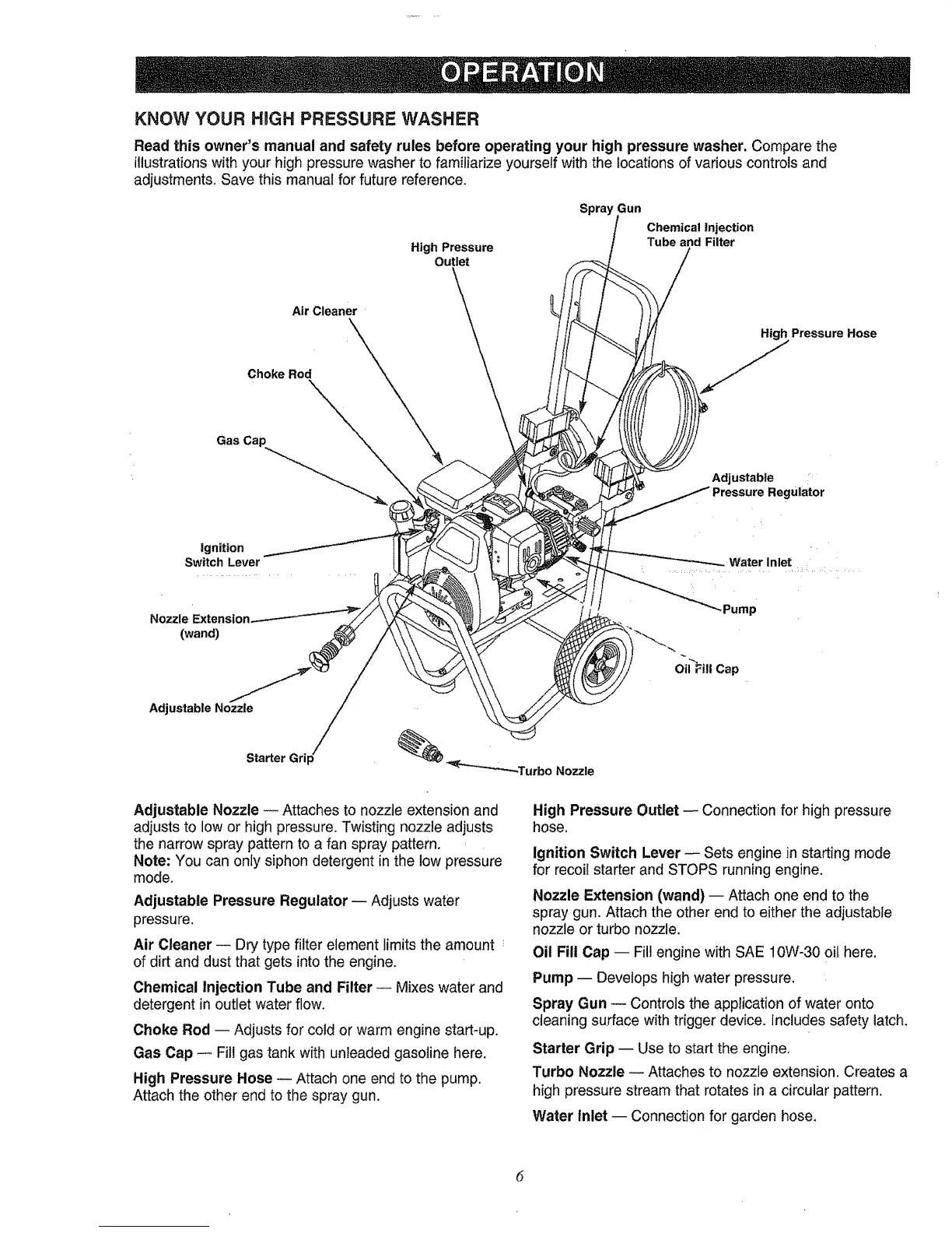 illustrations with your high pressure washer to familiarize yourself with the locations of various controls and