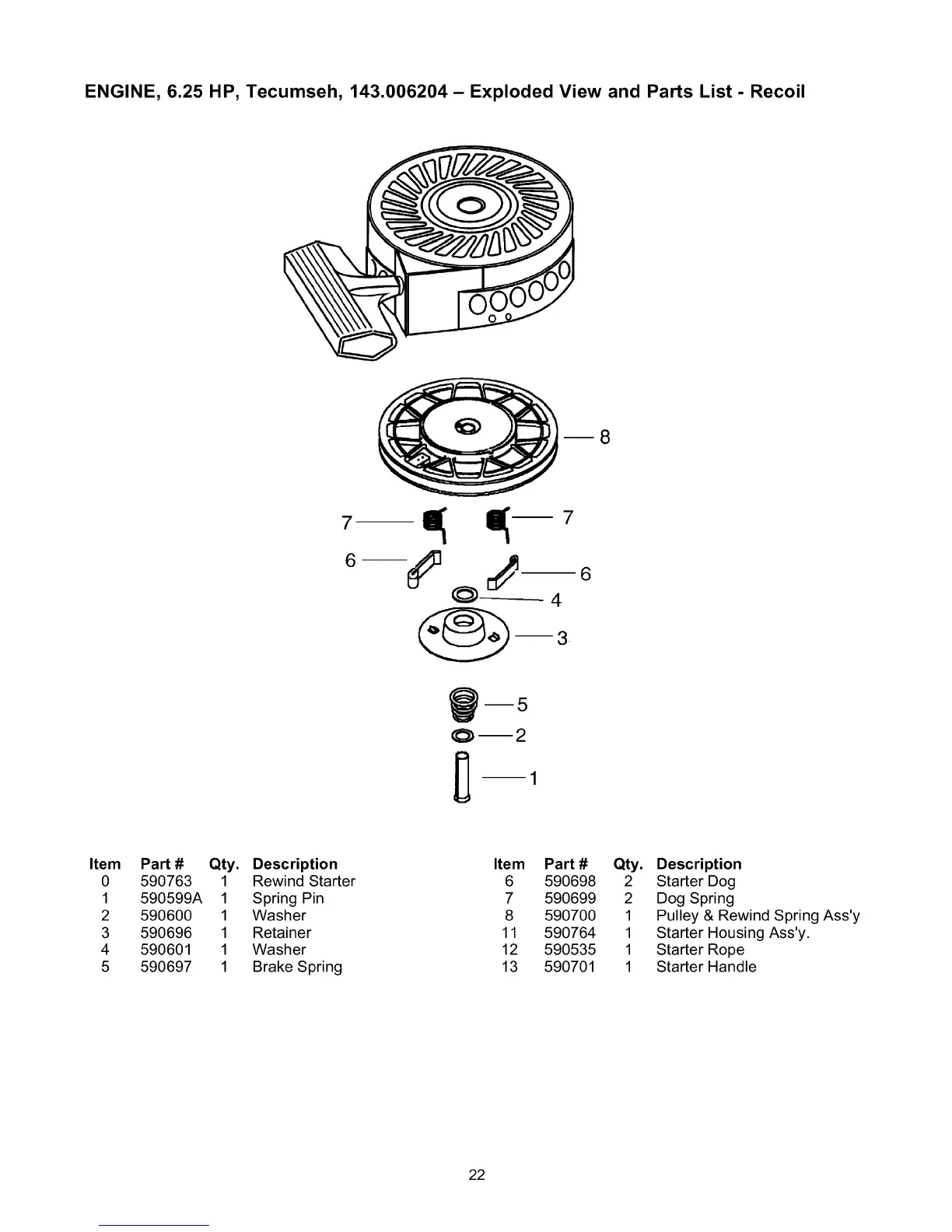 ENGINE, 6.25 HP, Tecumseh, 143.006204 - Exploded View and Parts List - Recoil