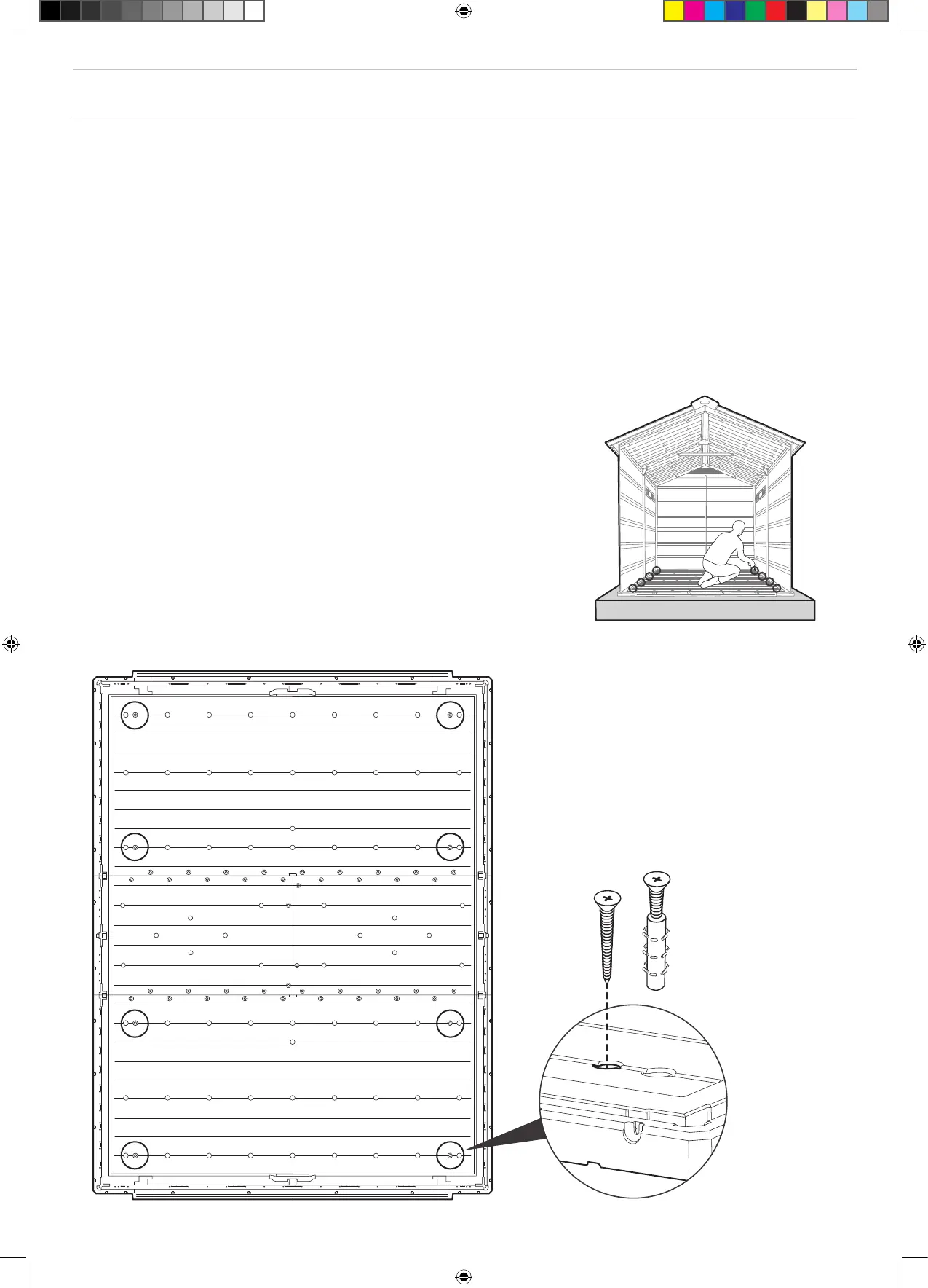 Fixez l’abri à la fondation en perçant des trous dans le sol aux endroits pré-marqués et en insérant des vis adéquates dans la fondation (vis non fournies).