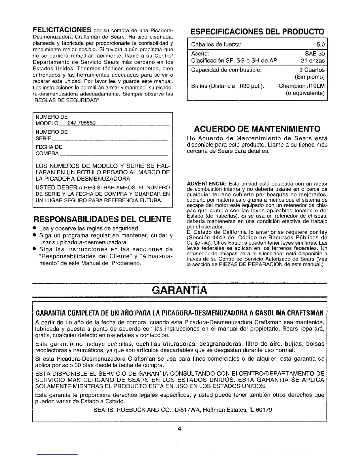 GARANTIACOMPLETA BE UN ANO PARA LA PICADORA-DESMENUZADORAA GASOLINA CRAFTSMAN