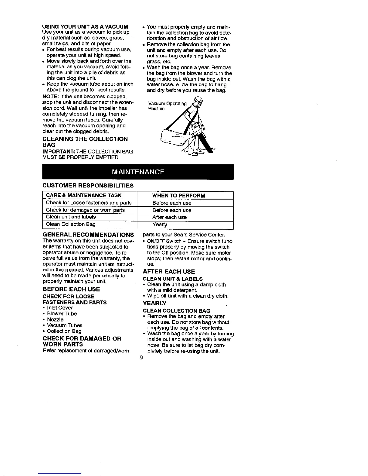 tain the collection bag to avoid dete-