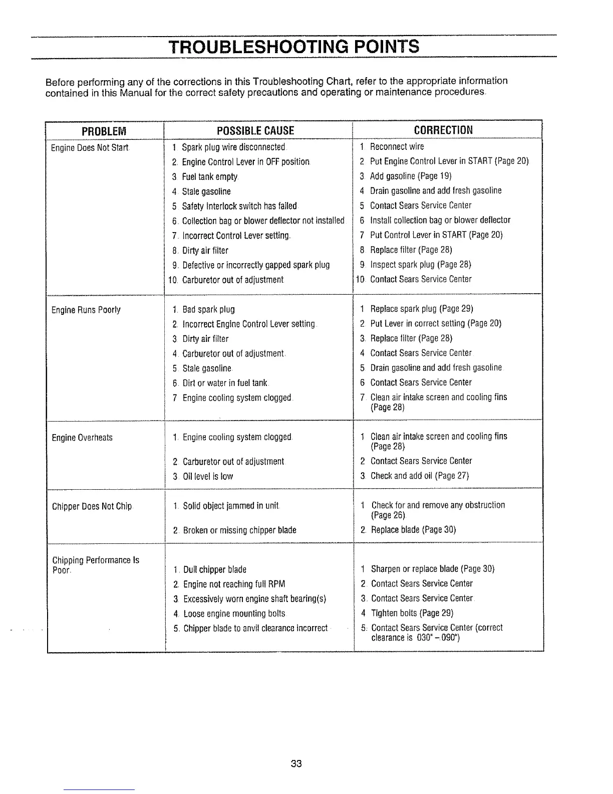 Before performing any of the corrections in this Troubleshooting Chart, refer to the appropriate information