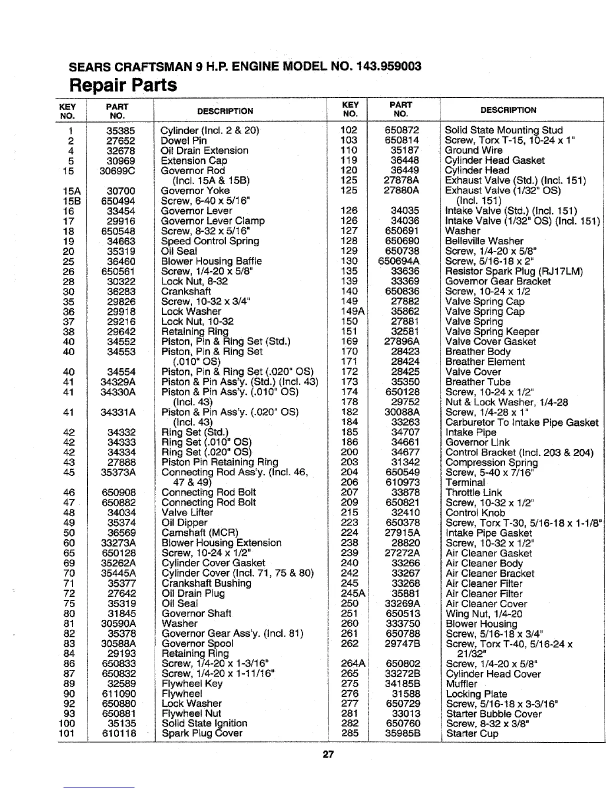 SEARS CRAFTSMAN 9 H.P. ENGINE MODEL NO. 143.959003