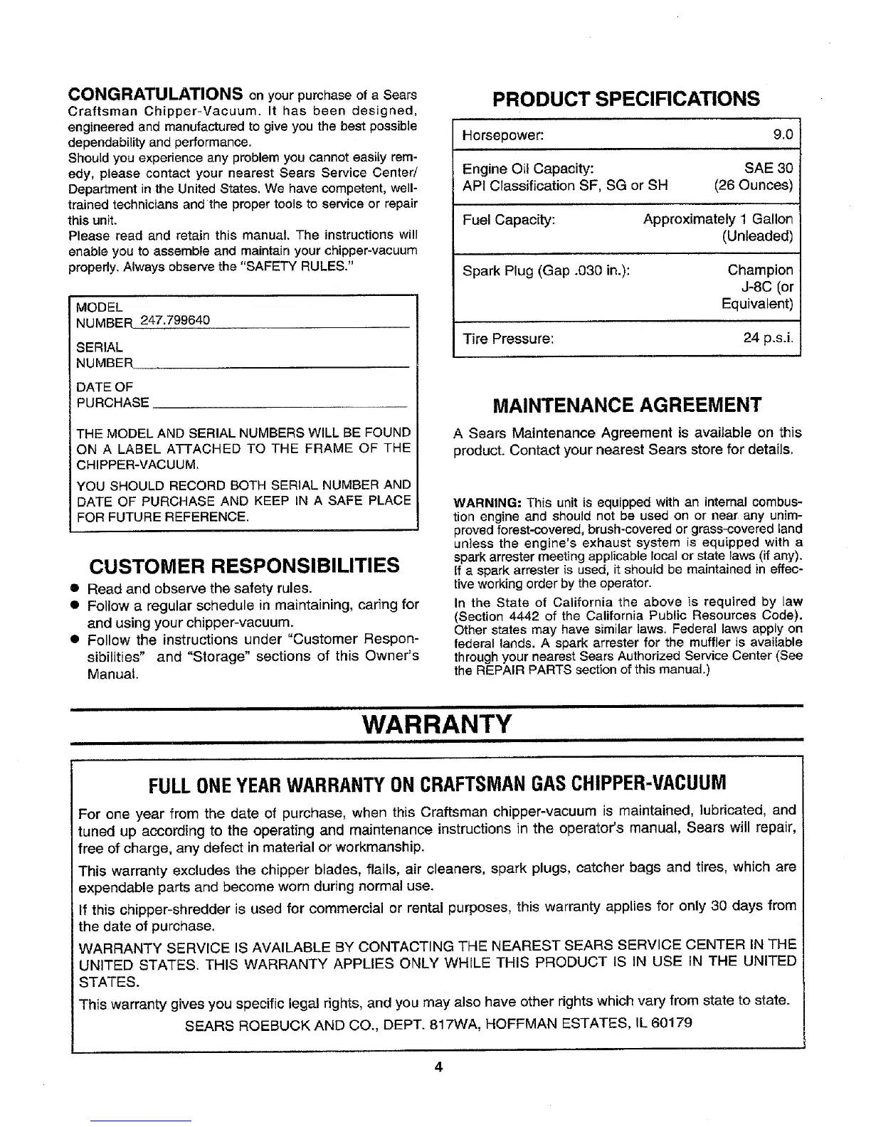 FULL ONE YEAR WARRANTY ON CRAFTSMAN GASCHIPPER-VACUUM