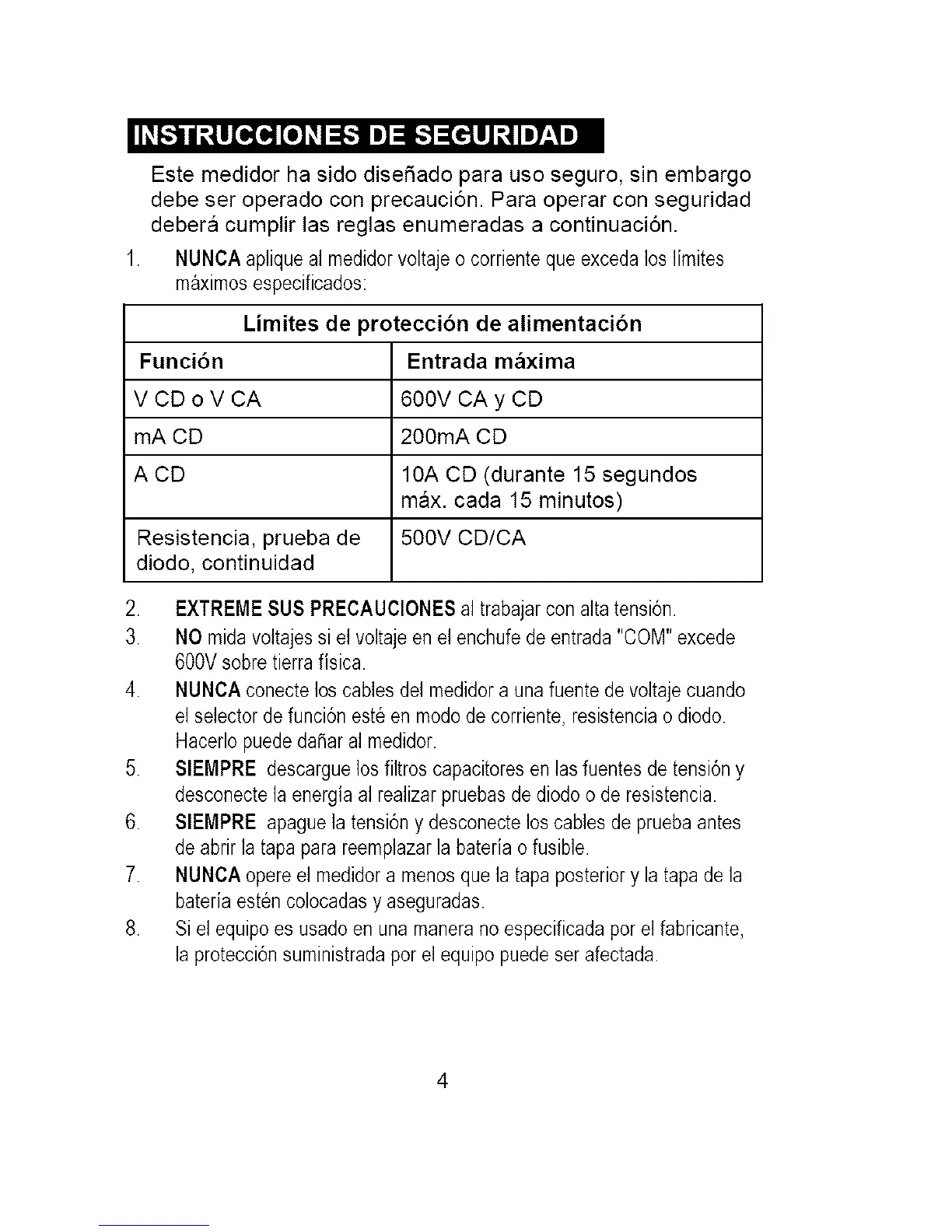 1. NUNCA apliqueal medidorvoltajeo corrienteque excedaloslimites