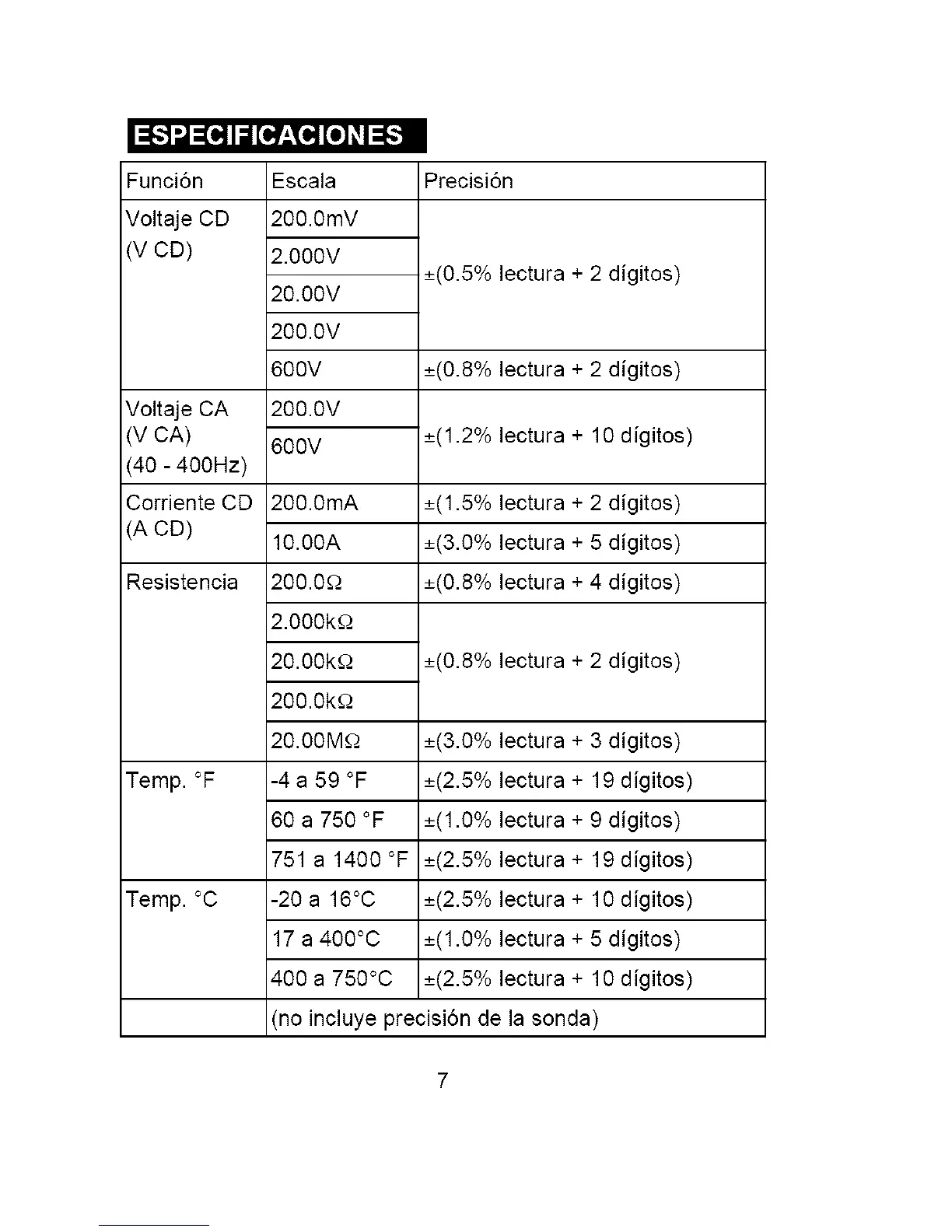 (no incluye precisi6n de la sonda)