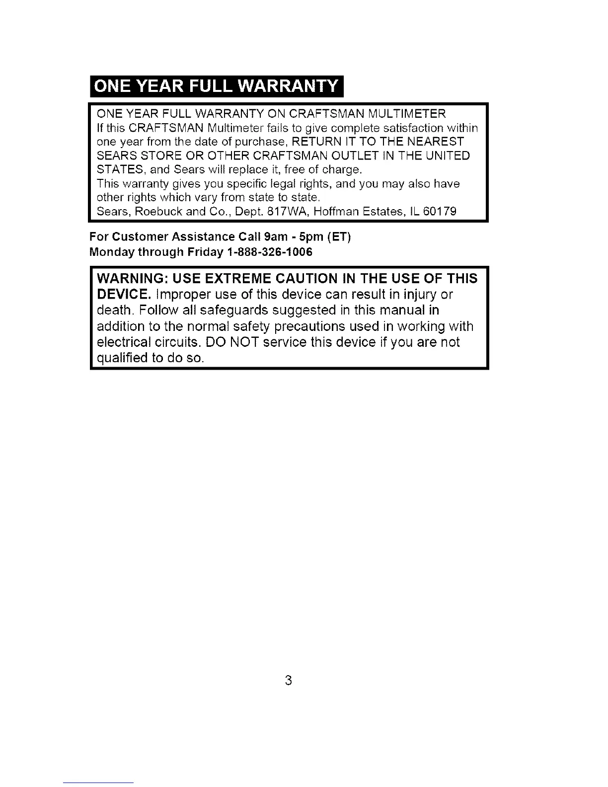 ONE YEAR FULL WARRANTY ON CRAFTSMAN MULTIMETER