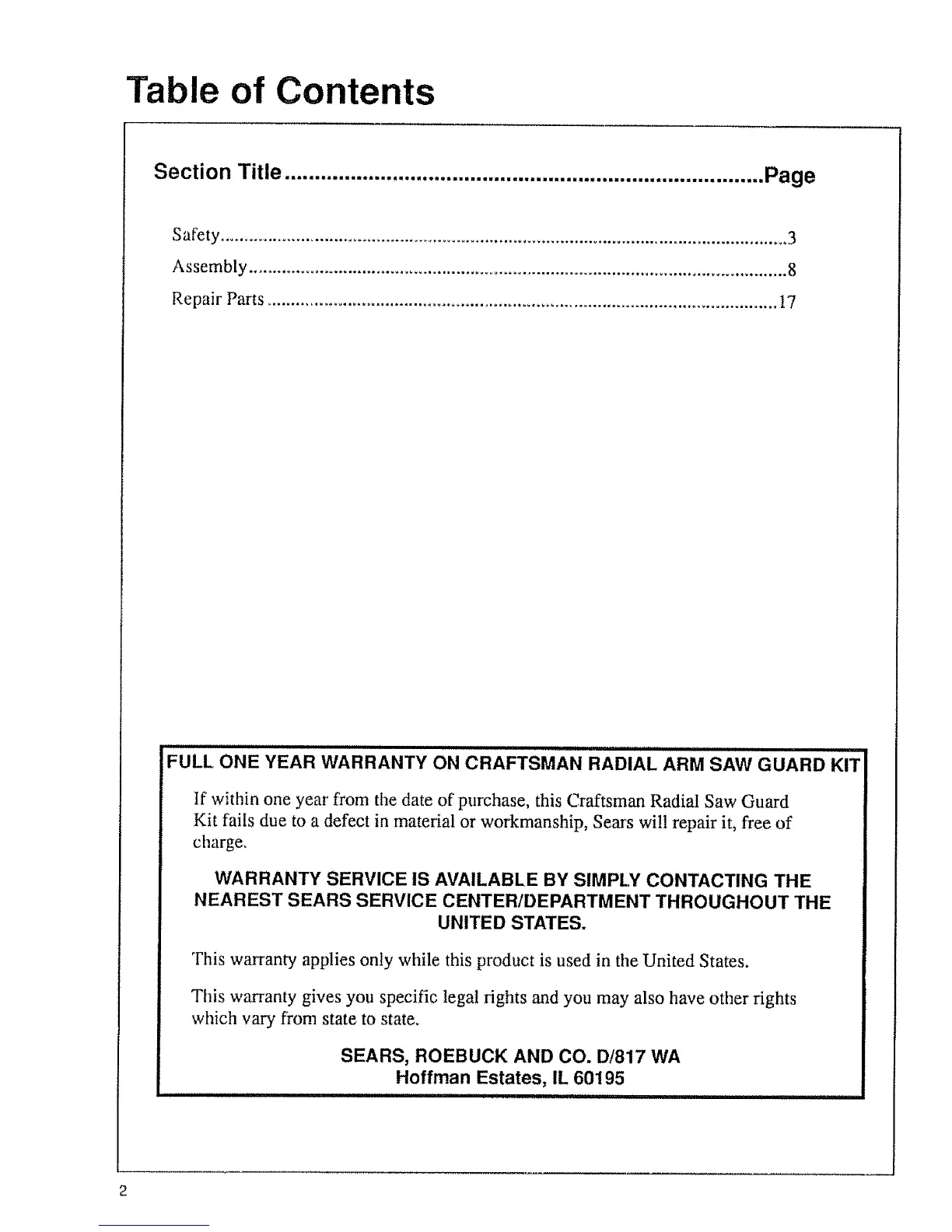 FULL ONE YEAR WARRANTY ON CRAFTSMAN RADIAL ARM SAW GUARD KIT