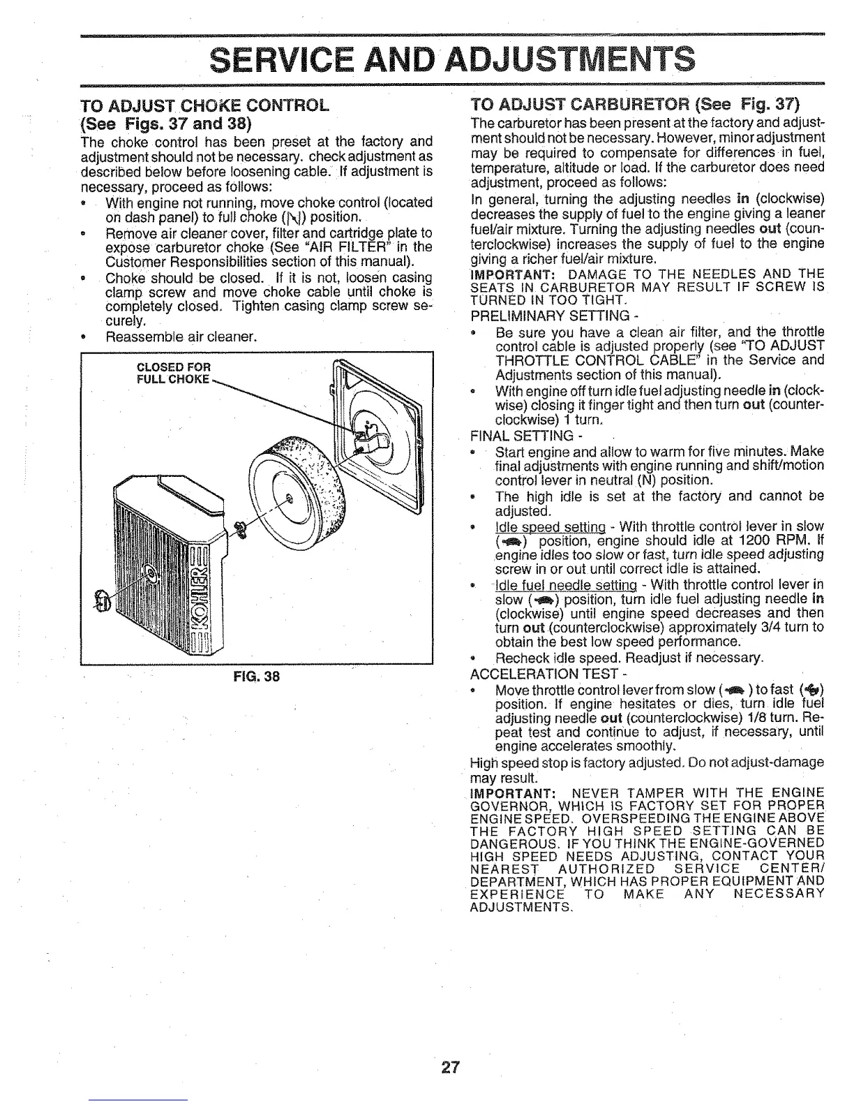 TO ADJUST CARBURETOR (See Fig. 37)