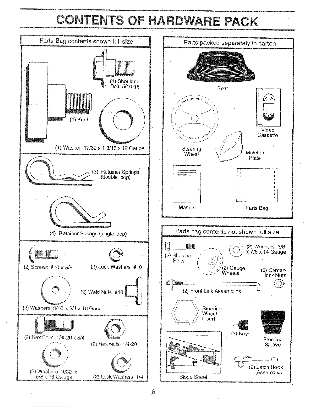 Parts bag contents not shown full size