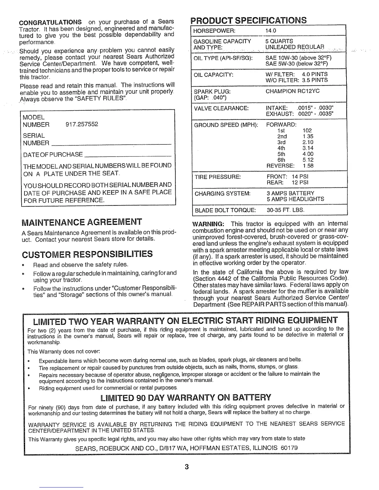 WARRANTY SERVICE IS AVAILABLE BY RETURNING THE RIDING EQUIPMENT TO THE NEAREST SEARS SERVICE