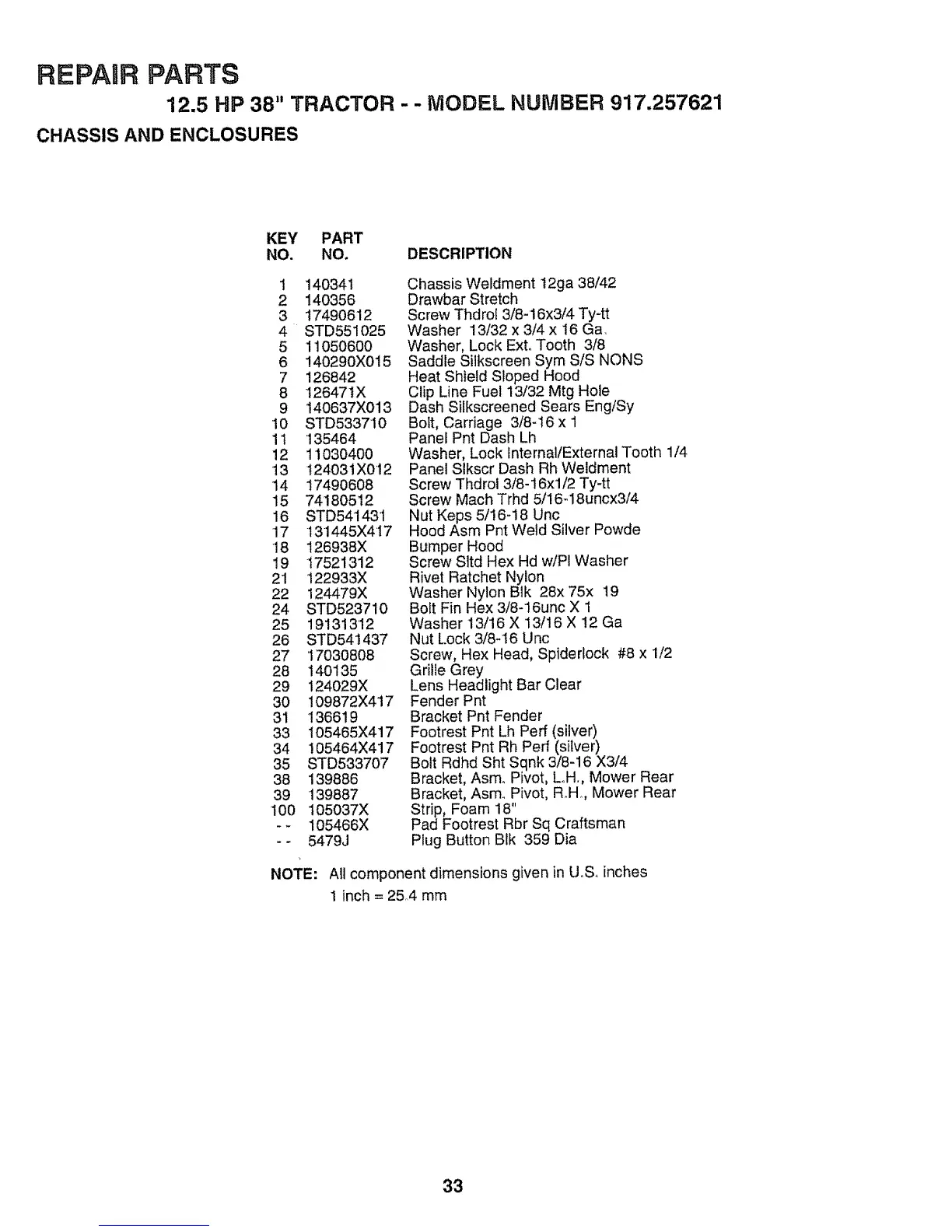 12.5 HP 38" TRACTOR - - MODEL NUMBER 917.257621