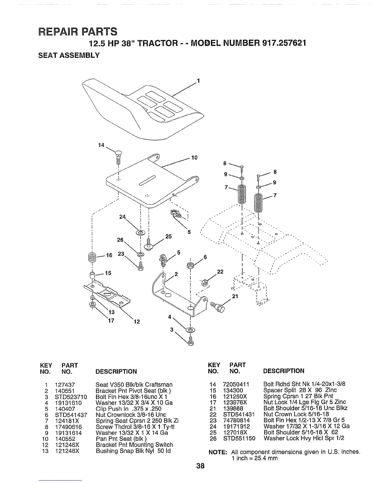 12.5 HP 38" TRACTOR - - MODEL NUMBER 917.257621