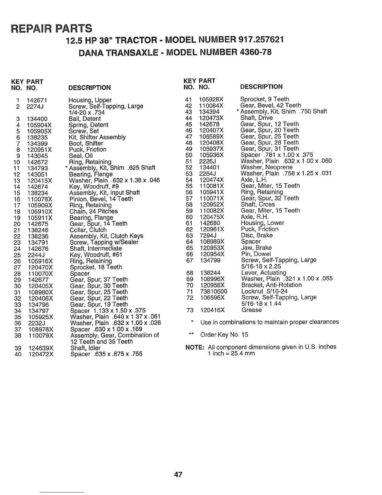 12.5 HP 38" TRACTOR - MODEL NUMBER 917,257621
