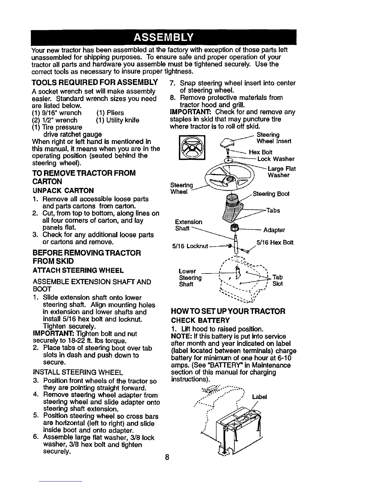 tractor all parts and hardware you assemble must be tightened securely. Use the