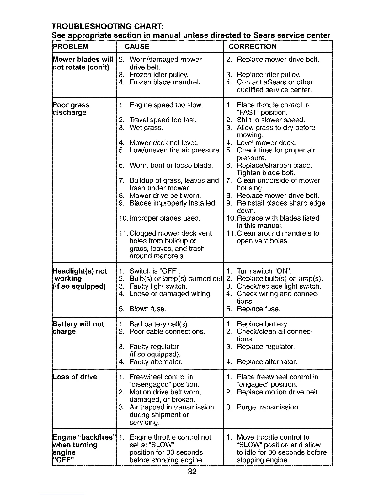 _ower blades will 2. Worn/damaged mower 2. Replace mower drive belt.