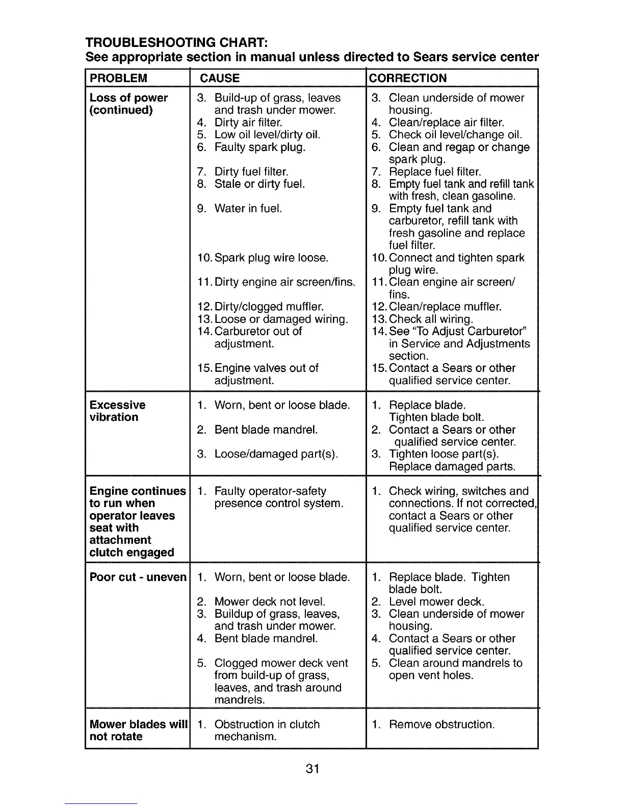See appropriate section in manual unless directed to Sears service center