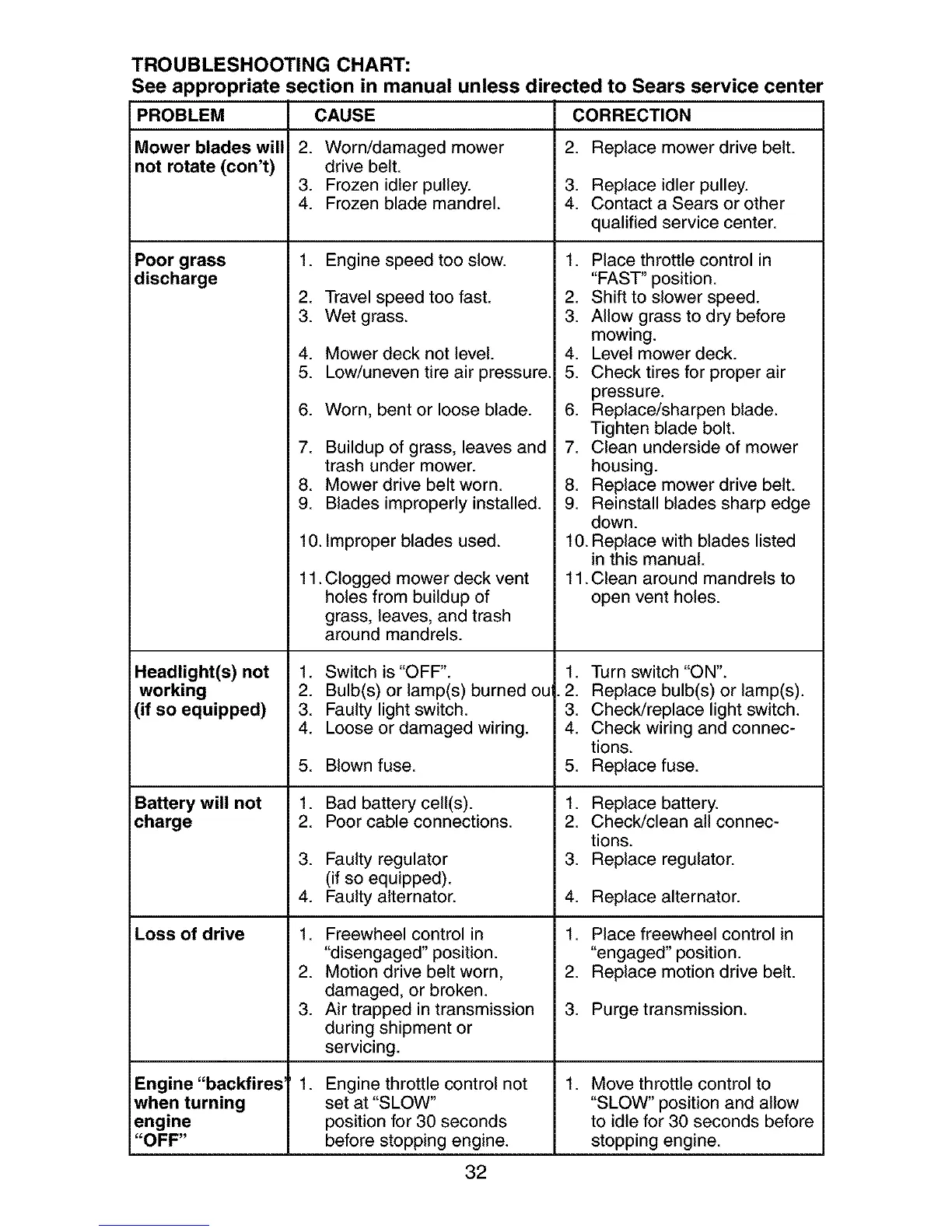 4. Frozen blade mandrel. 4. Contact a Sears or other
