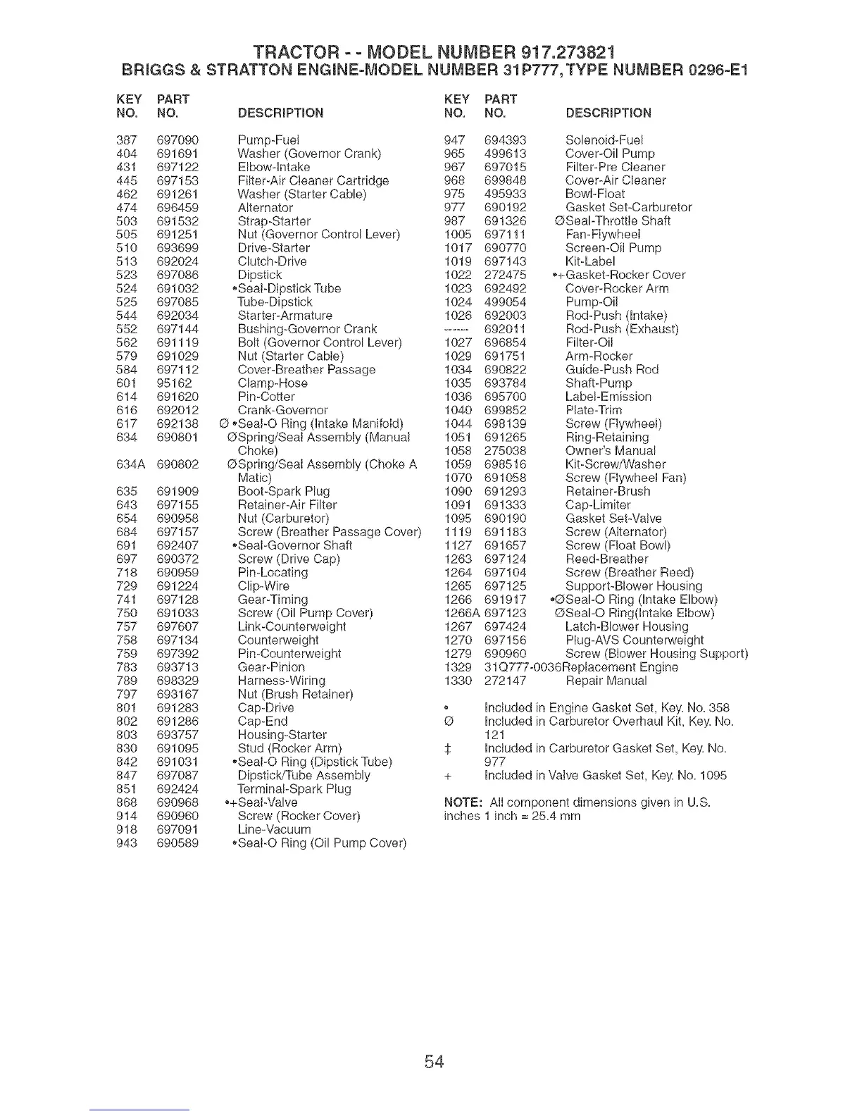 Included in Carburetor Gasket Set, Key. No.