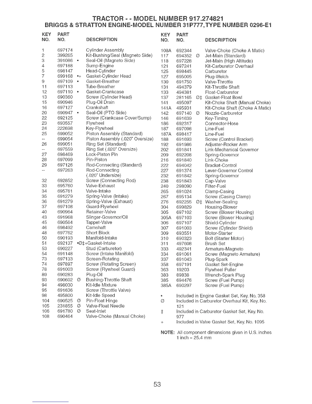 15 690946 Plug-Oil Drain 141 495097 Kit-Choke Shaft (Manual Choke)