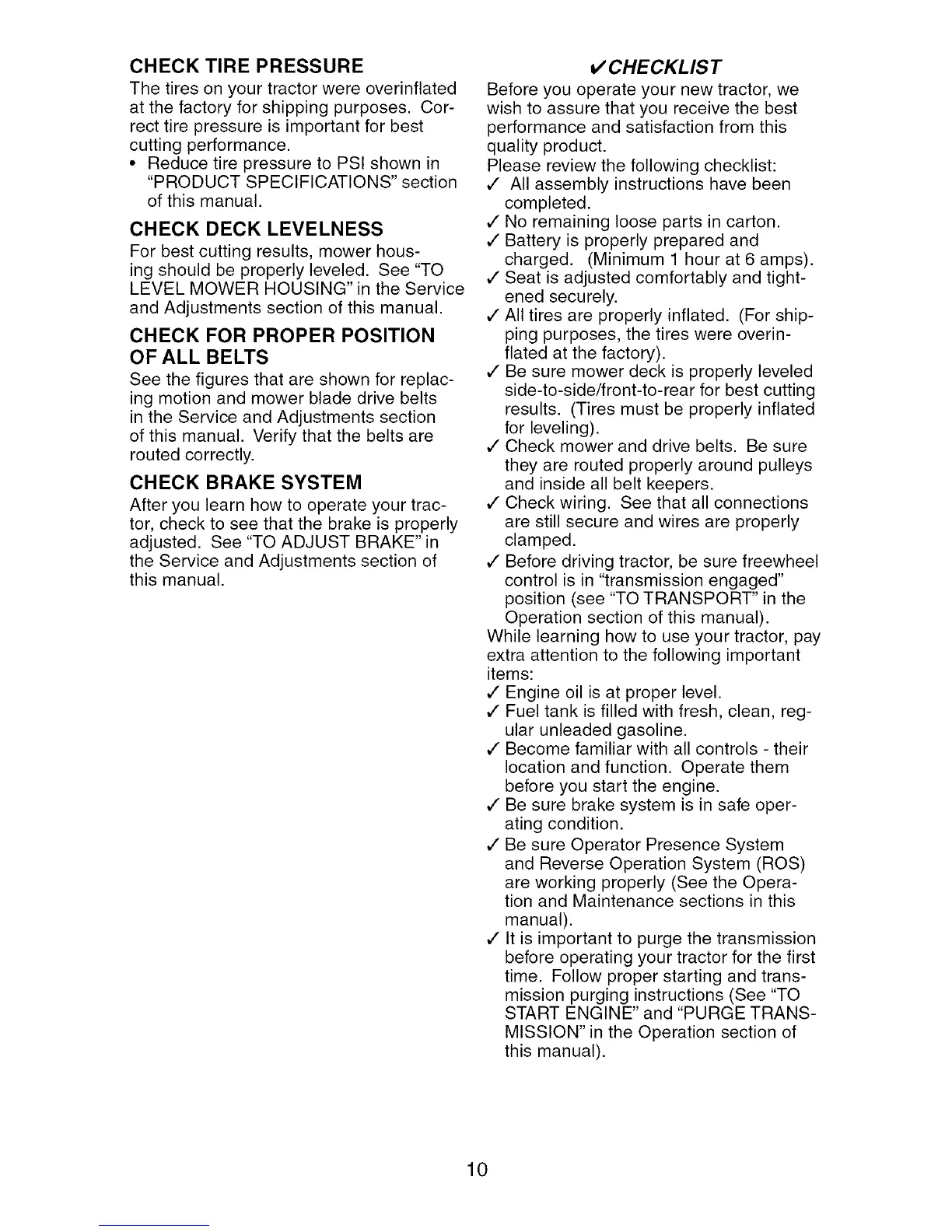 v" Check mower and drive belts. Be sure