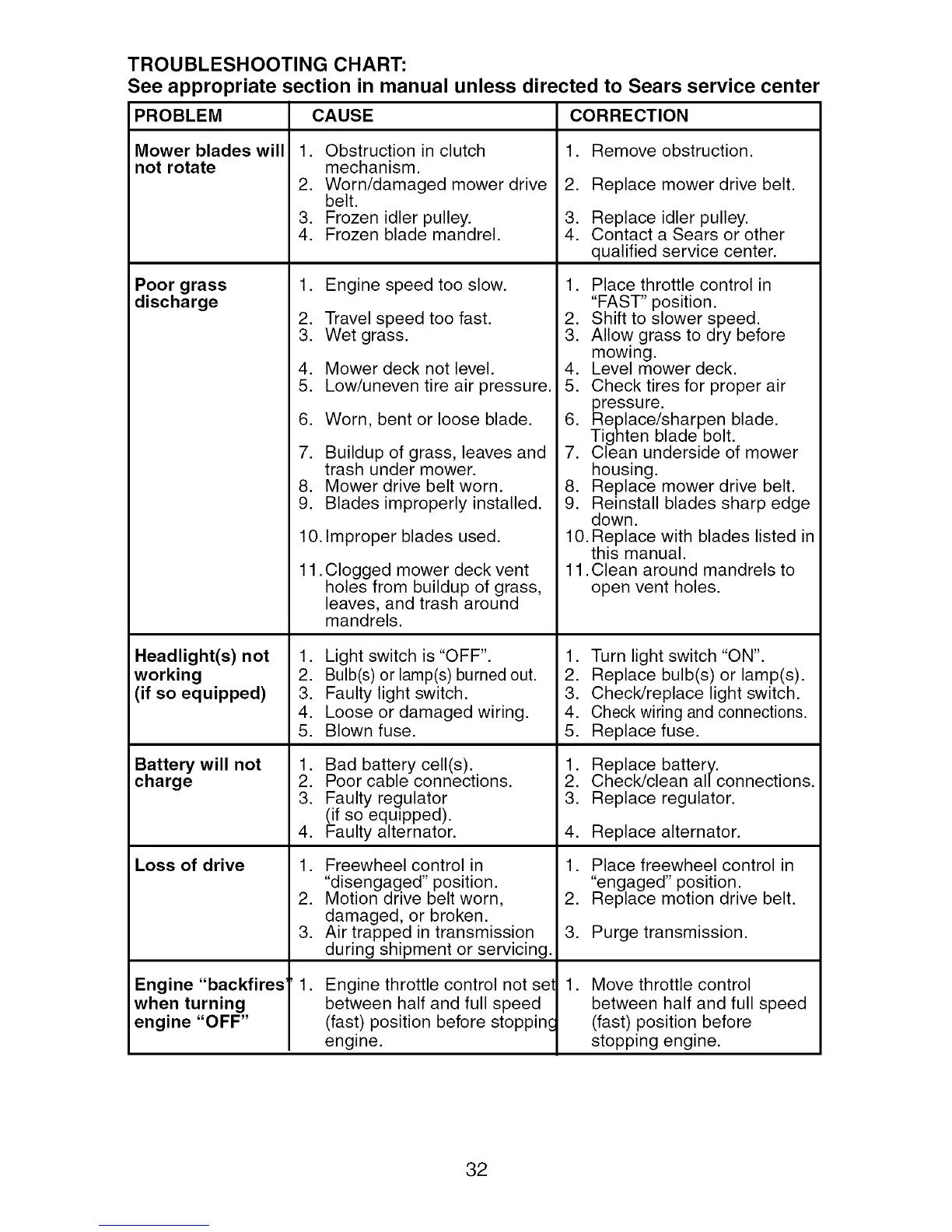 See appropriate section in manual unless directed to Sears service center