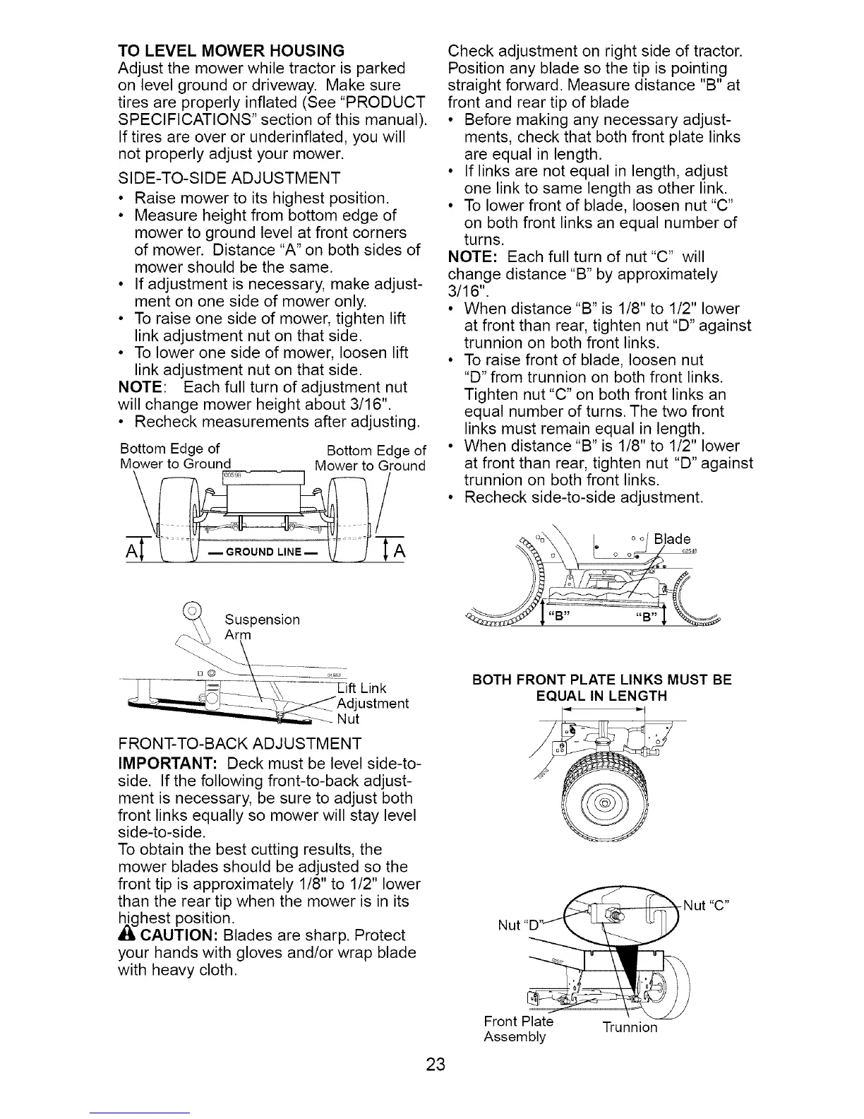 • To lower front of blade, loosen nut "C"