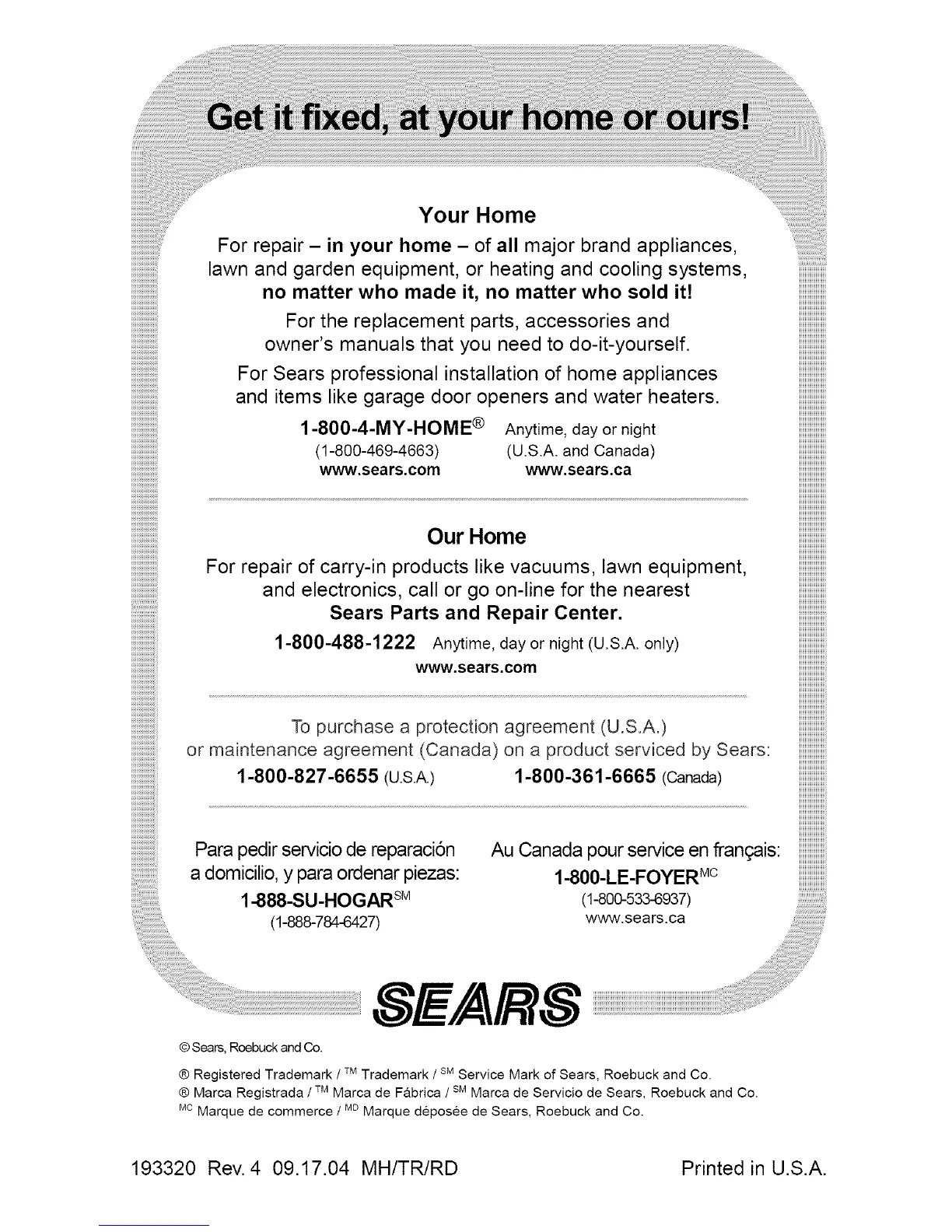 ® Marca Registrada / TM Marca de Fabrica I SMMarca de Servicio de Sears, Roebuck and Co.