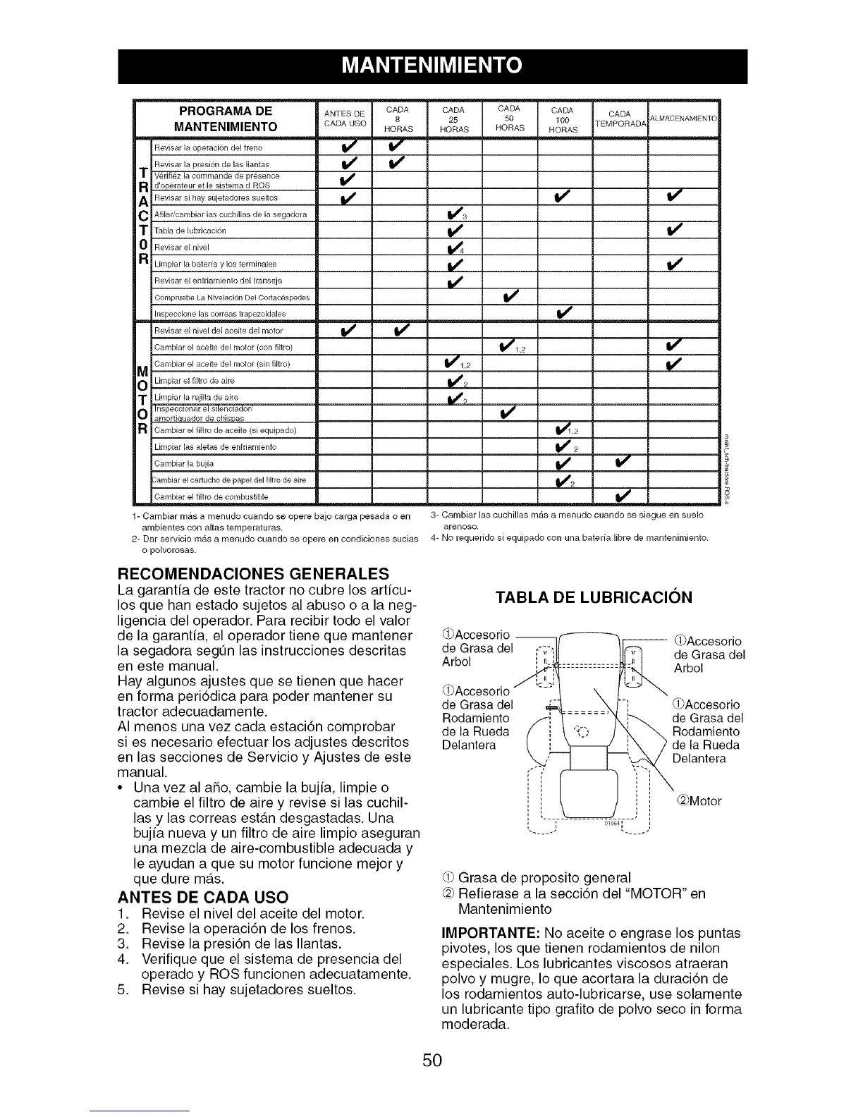 2- Dar servicio m_s a menudo cuando se opere en condiciones sucias 4- No requerido si equipado con una bateria libre de mantenimiento.