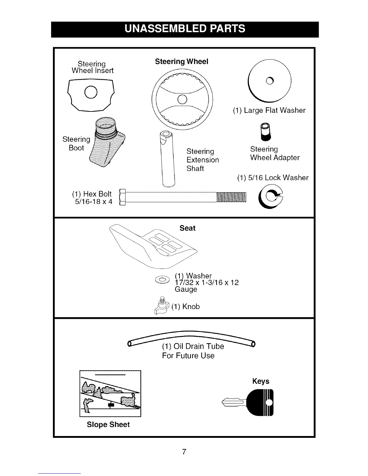 Craftsman 917.276821 - Unassembled Parts Identification; Steering, Seat, and Drain Tube Parts