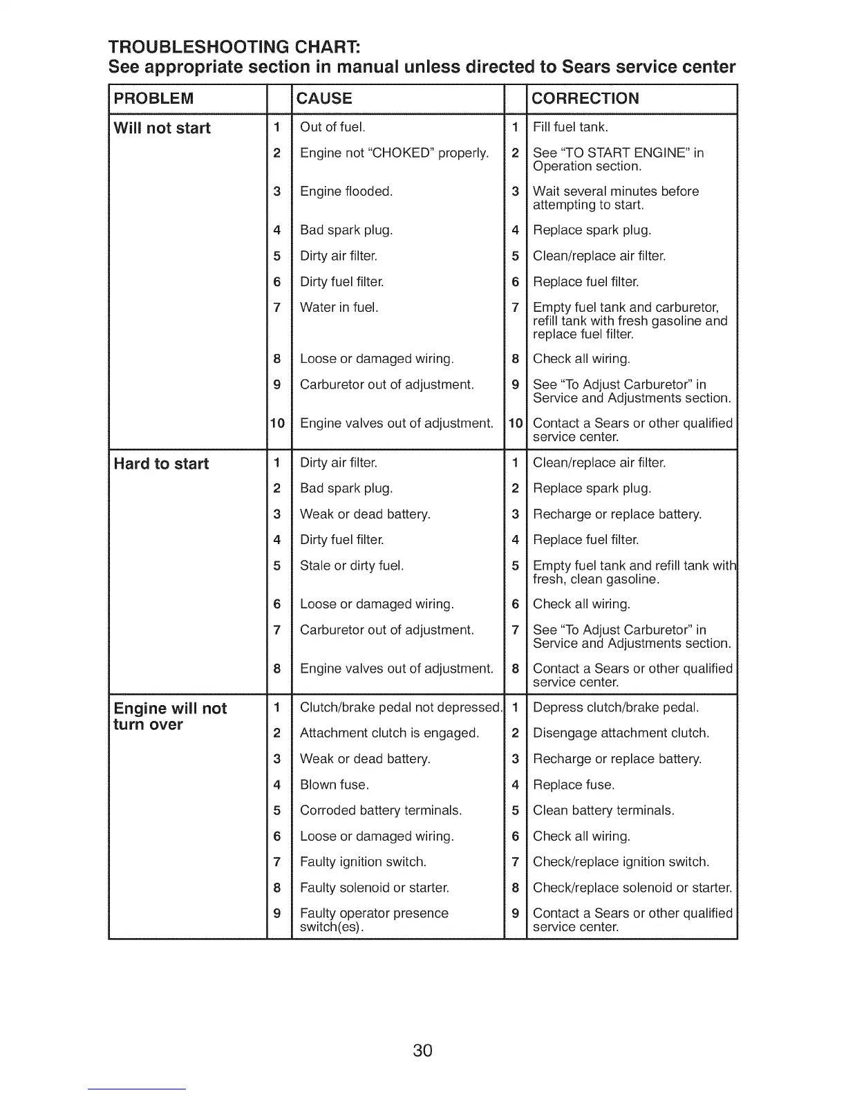See appropriate section in manual unless directed to Sears service center