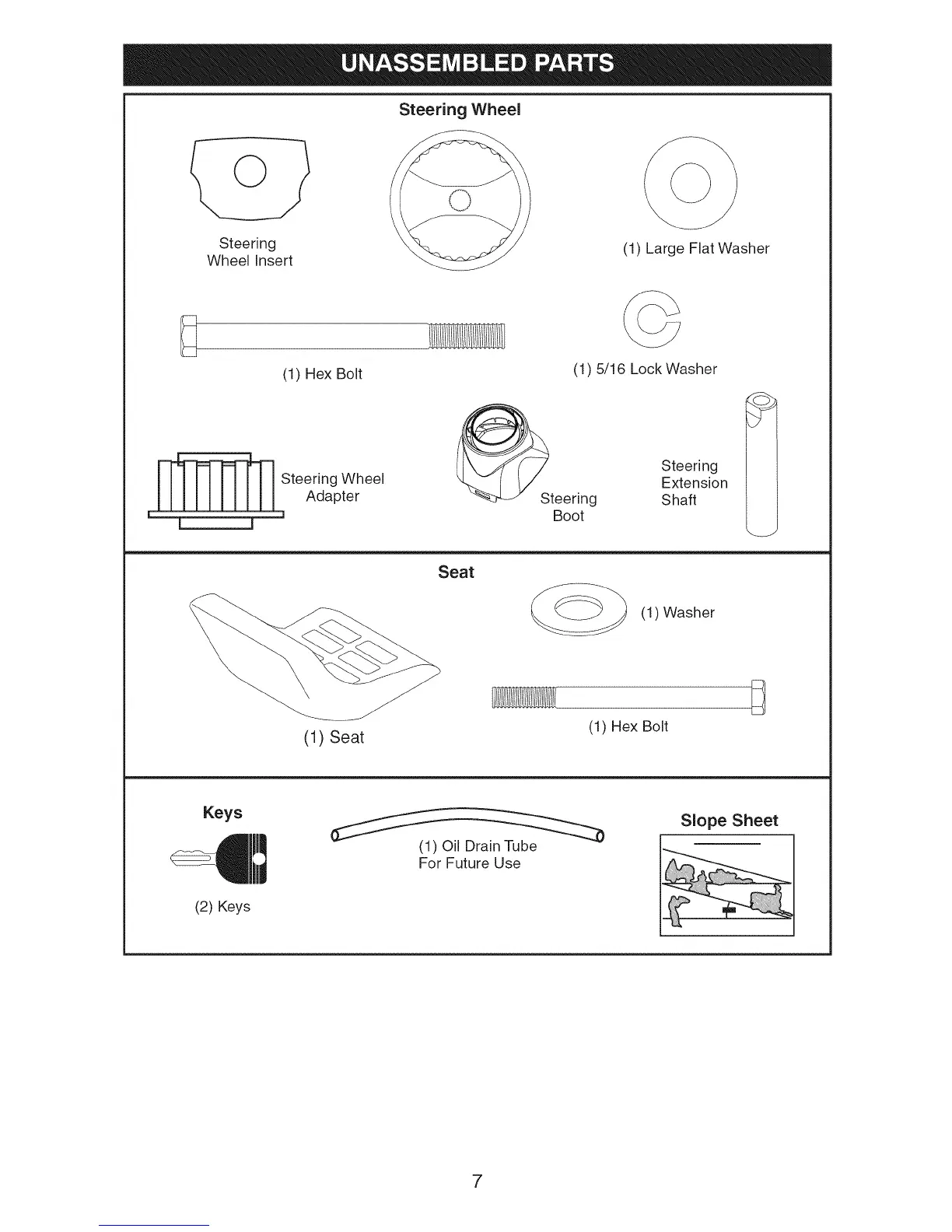 Craftsman 917.28813 - UNASSEMBLED PARTS; Steering Wheel Assembly Components; Seat Assembly Components; Included Accessories