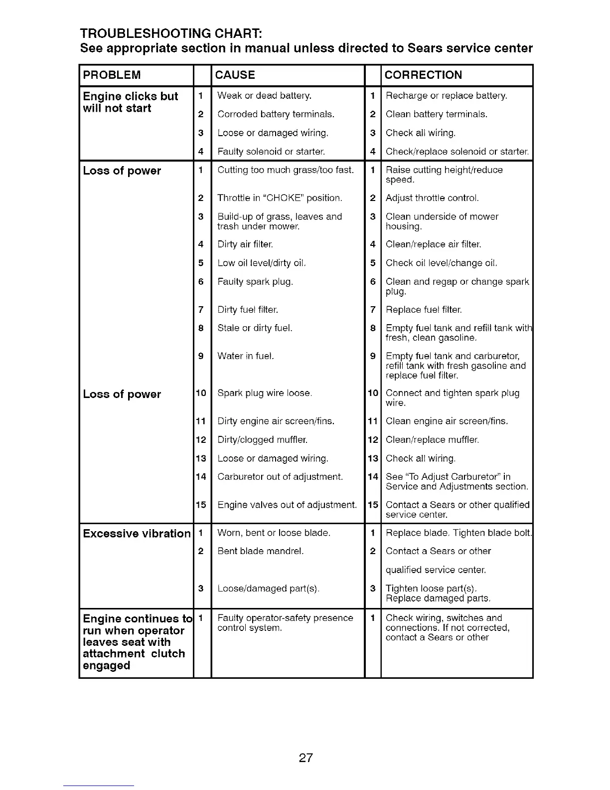 See appropriate section in manual unless directed to Sears service center