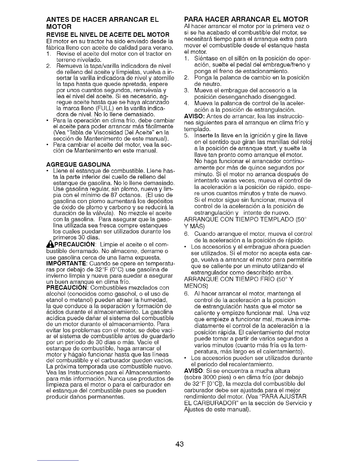 ras por debajo de 32°F (0°C) use gasolina de