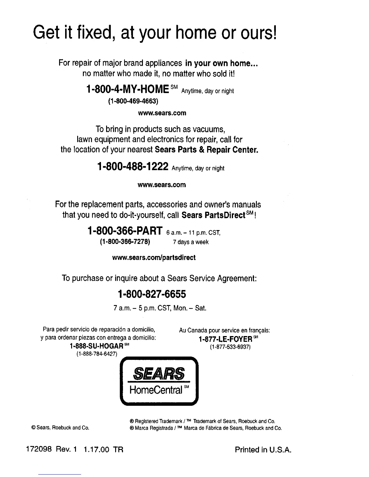 172098 Rev. 1 1.17.00 TR Printed in U.S.A.