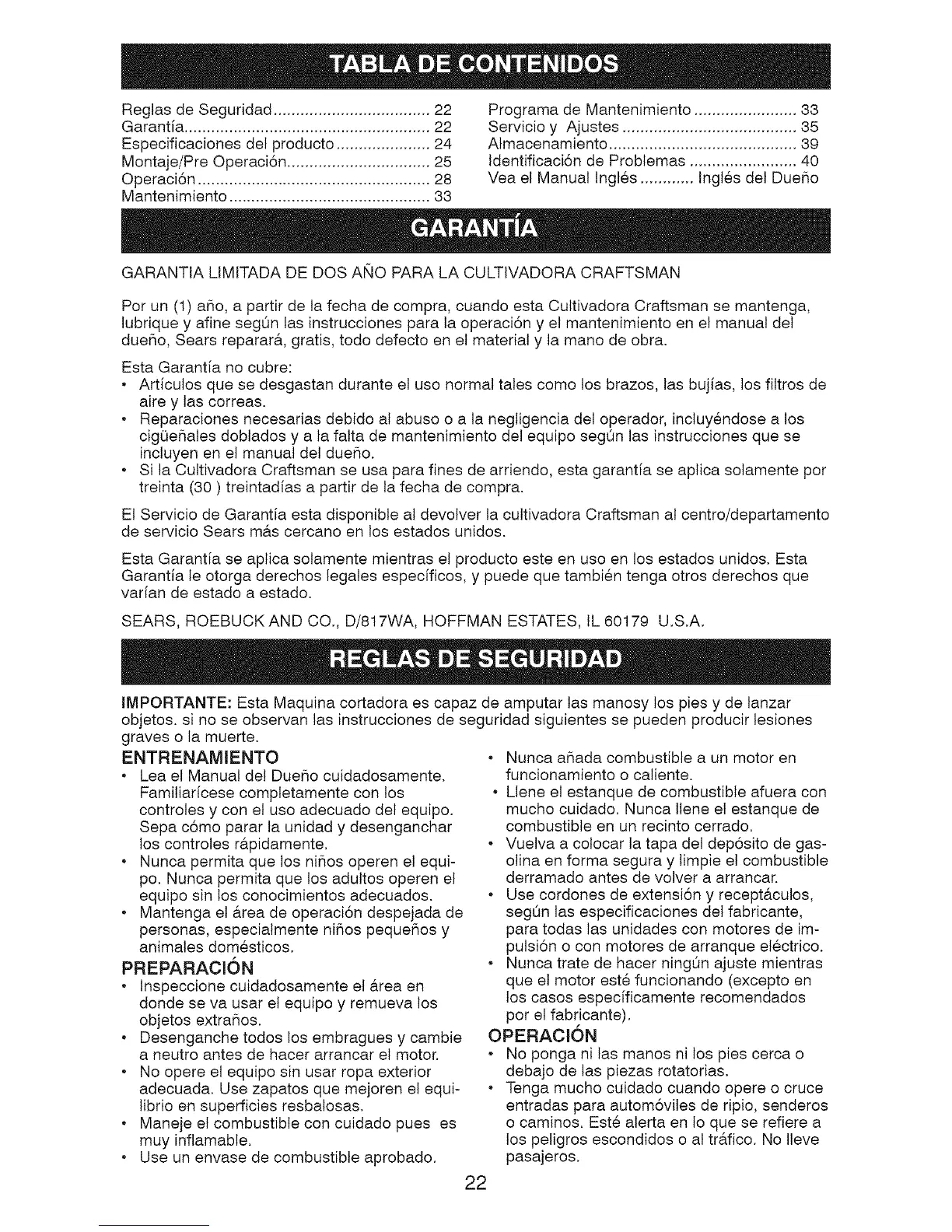 El Servicio de Garanfia esta disponible al devolver la cultivadora Craftsman al centro/departamento