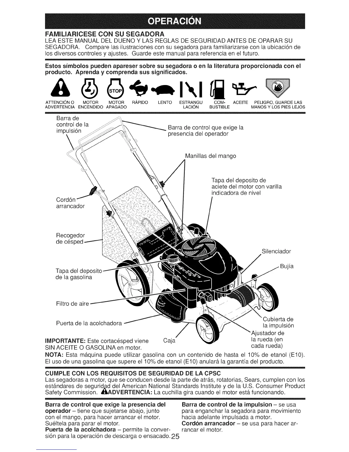 NOTA: Esta m_.quina puede utilizar gasolina con un contenido de hasta el 10% de etanol (El0).