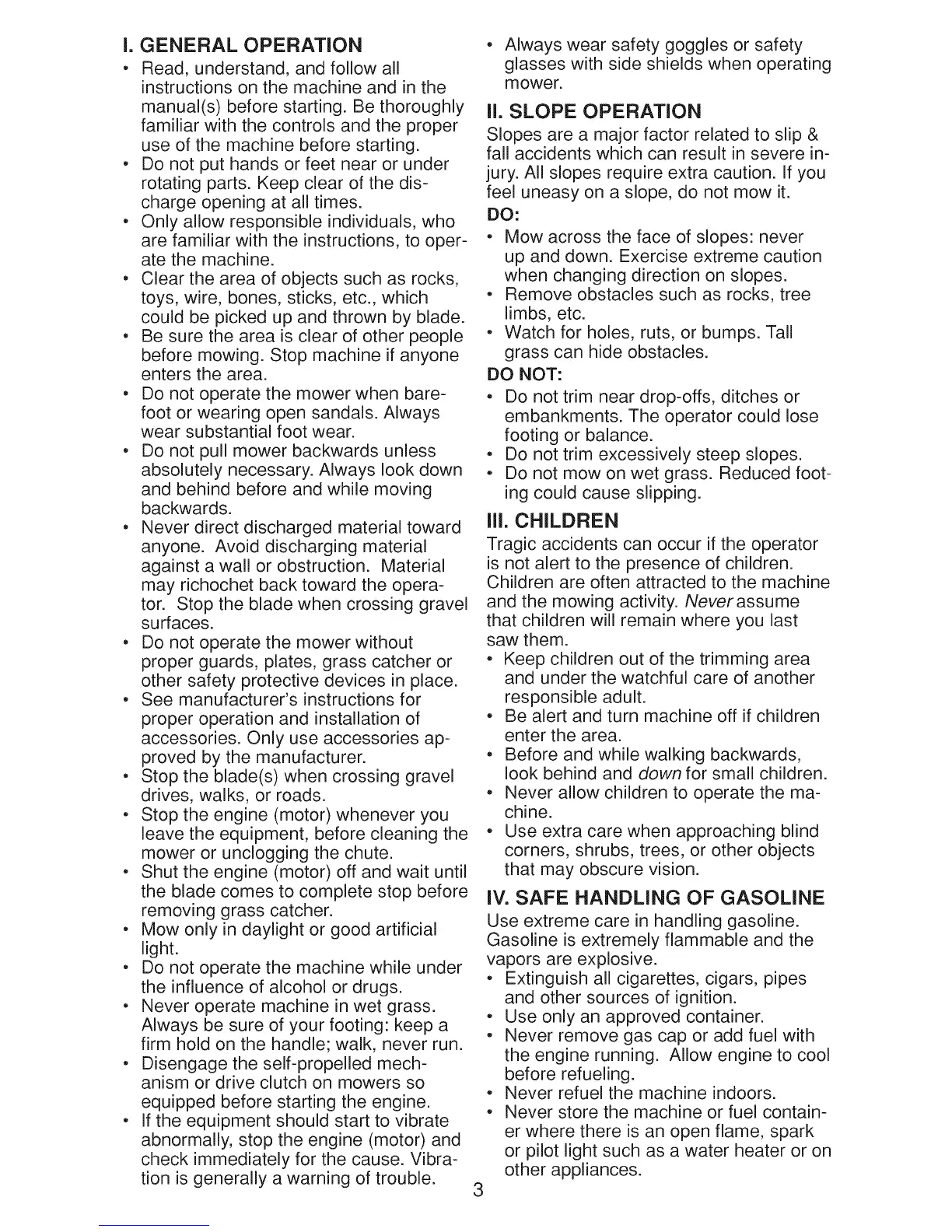 Craftsman 917.370430 - General Operation and Safety; Slope Operation; Children Safety; Safe Handling of Gasoline