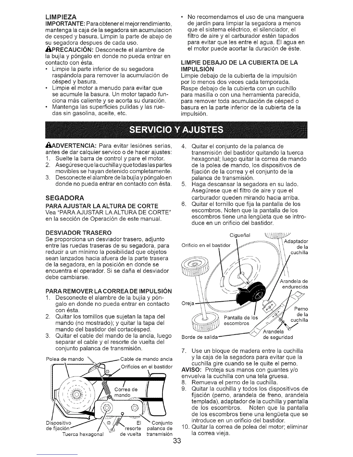 Limpie debajo de la cubierta de la impulsi6n