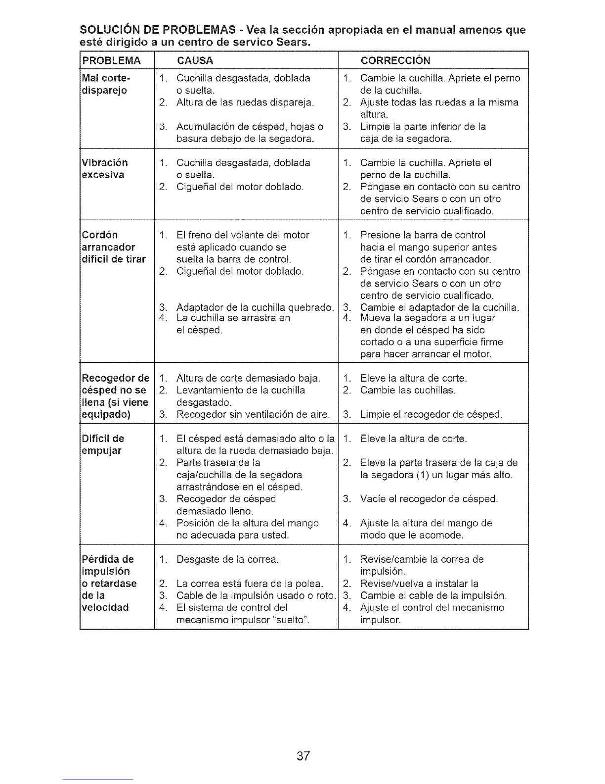 SOLUCION DE PROBLEMAS - Yea ia secci6n apropiada en el manual amenos que