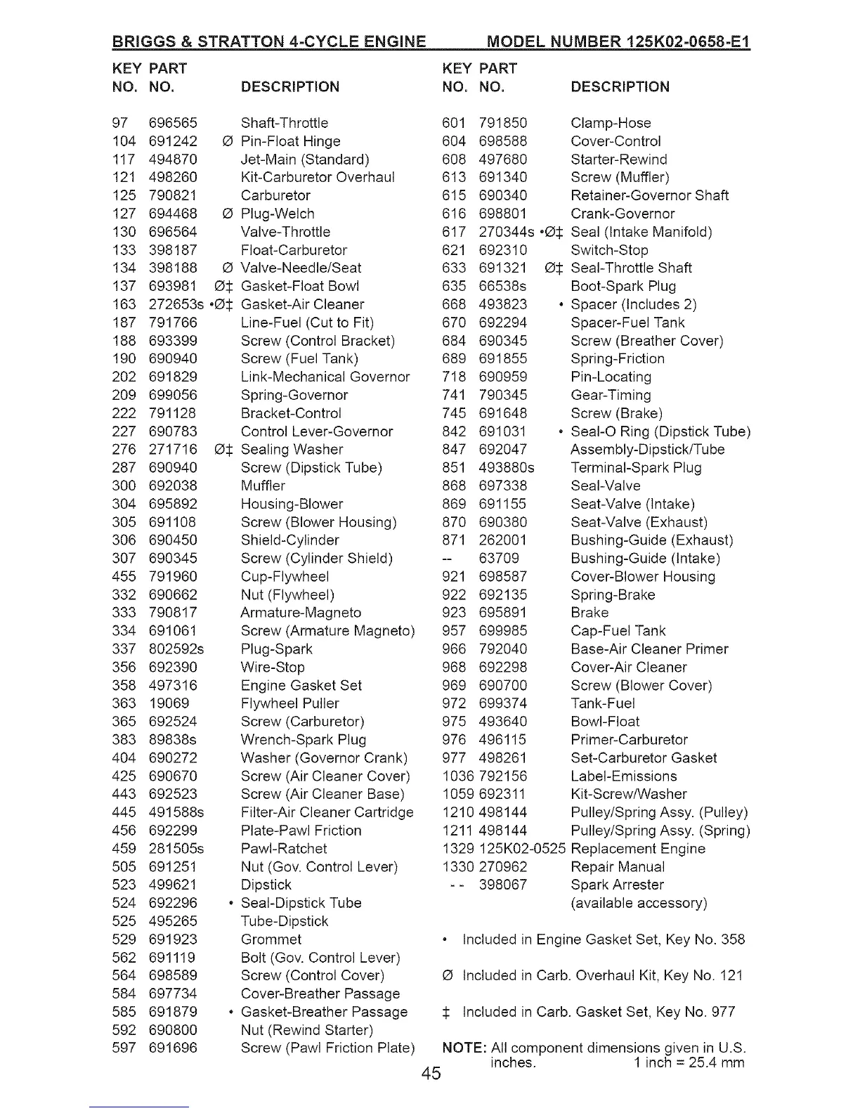597 691696 Screw (Pawl Friction Plate) NOTE: All component dimensions given in U.S.