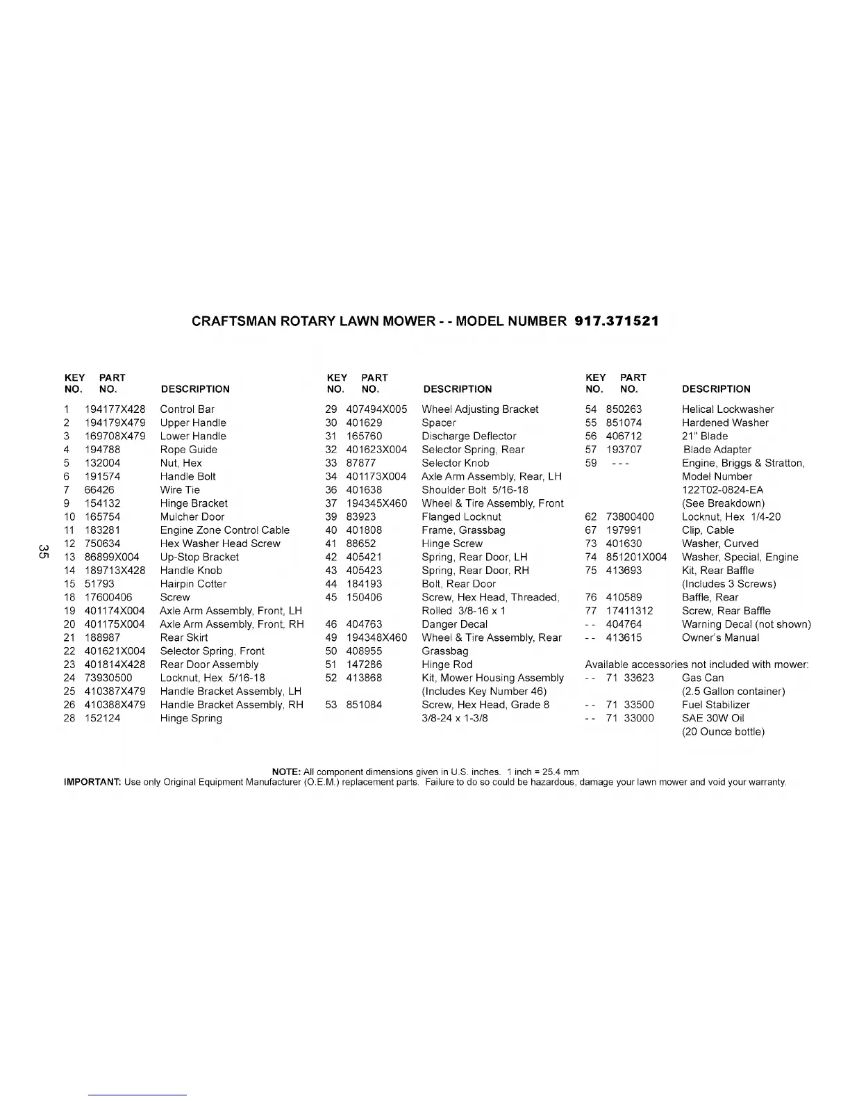 IMPORTANT: Use only Original Equipment Manufacturer (O.EM.) replacement parts. Failure to do so could be hazardous, damage your lawn mower and void your warranty.