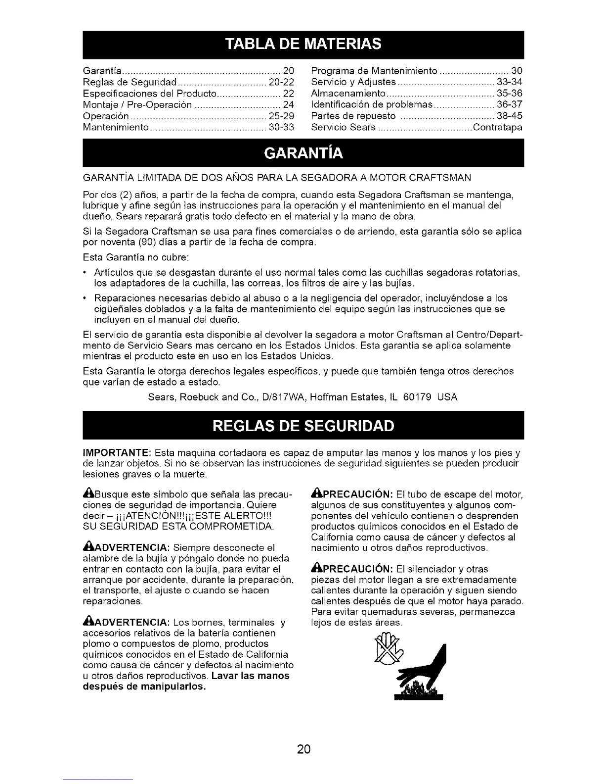 El servicio de garantia esta disponible al devolver la segadora a motor Craftsman al Centro/Depart-