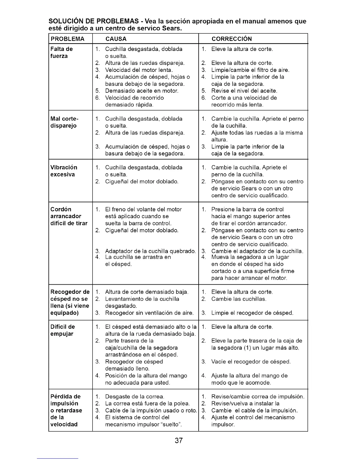 1. Revise/cambie correa de impulsion.