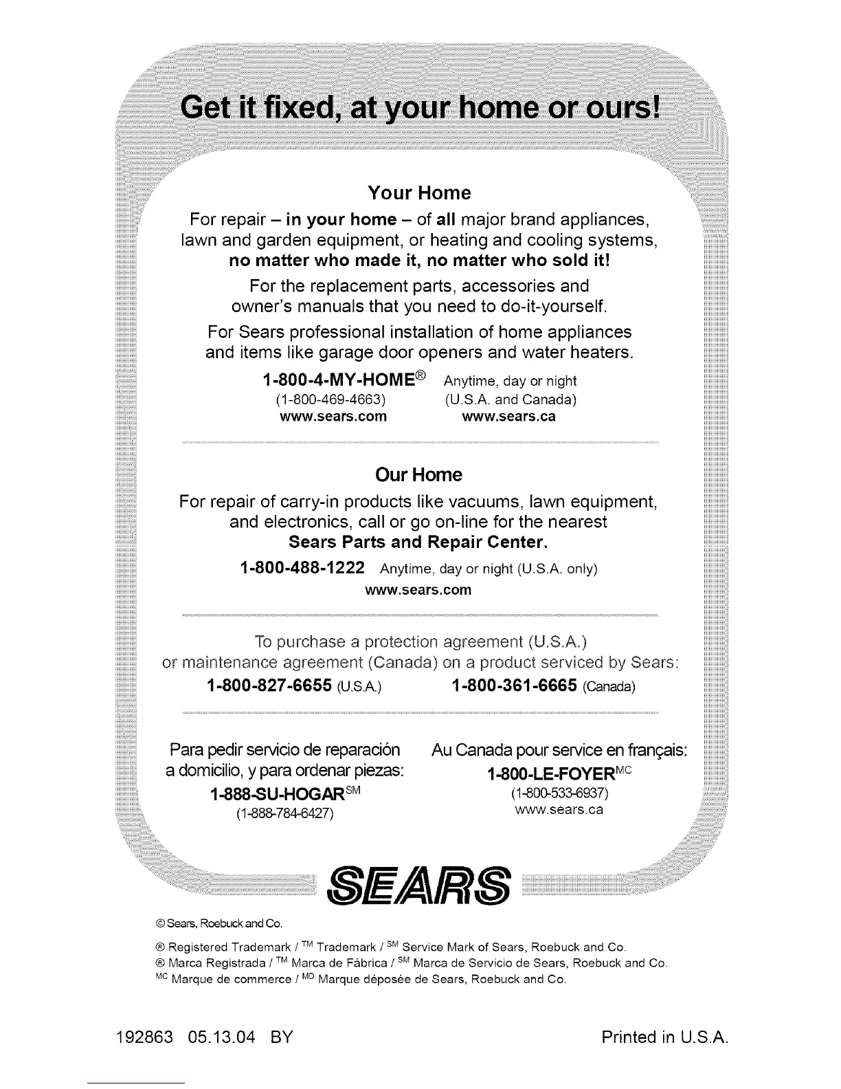 ® Marca Registrada / TM Marca de F&brica / SMMarca de Servicio de Sears, Roebuck and Co.