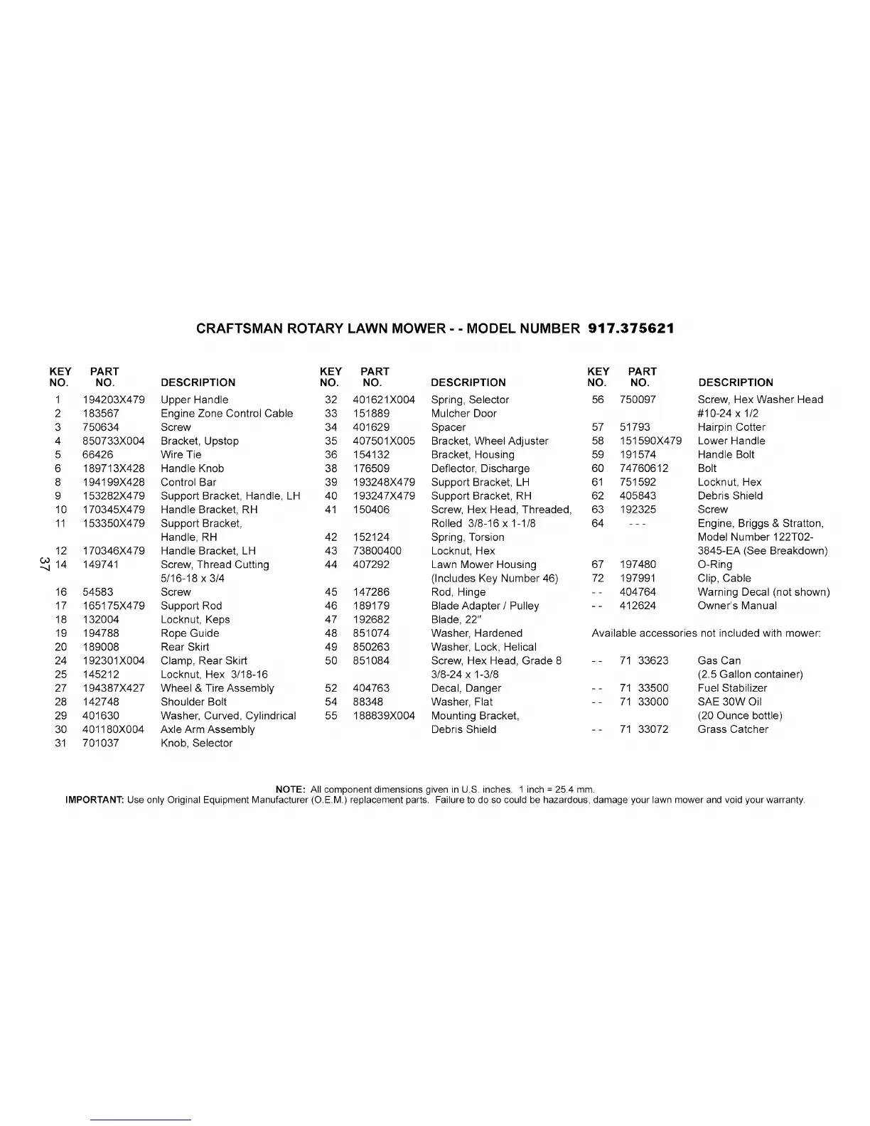 IMPORTANT: Use only Original Equipment Manufacturer (O,EM) replacement parts, Failure to do so could be hazardous, damage your lawn mower and void your warranty,