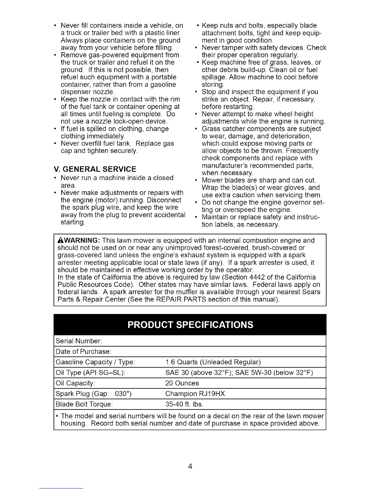 federal lands. A spark arrester for the muffler is available through your nearest Sears